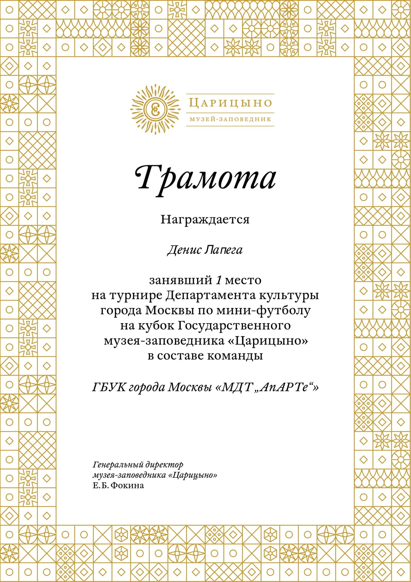 Игроки сборной театра «АпАРТе» по мини-футболу получили Грамоты за победу в традиционном турнире Департамента культуры г. Москвы на кубок Государственного музея-заповедника «Царицыно».