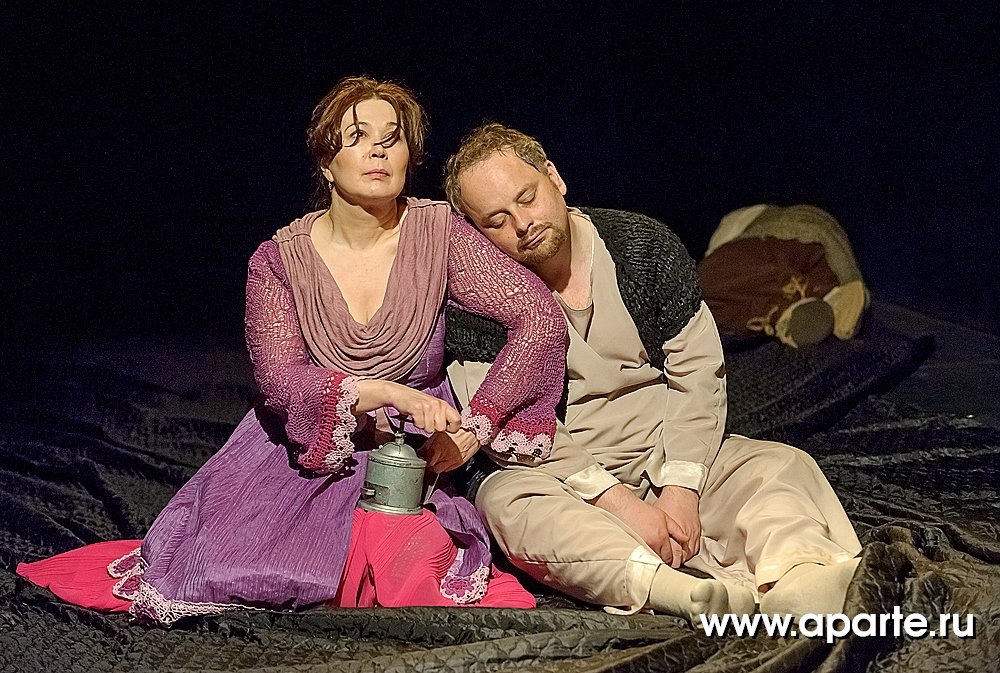 В спектакле всего пять персонажей. Прекрасная волнующая музыка. И удивительная сценография, главным элементом которой становится Одеяло – оно и покров, и ширма, и волны, и жизненные обстоятельства. Одеяло – облако-трон для Ольги, объясняющейся в любви, календарь, отсчитывающий время и всеобъемлющий символ пространства. Одеяло – мебель. Одеяло – путы, пелены (когда вплотную надвигается свадьба). Одеяло – черный коридор в небытие. Оно сворачивается в кокон, из которого, кажется, уже не выбраться. Оно то расползается в ковер, то скручивается в омут. И уползает, как жизнь, за кулису.